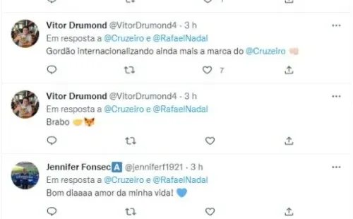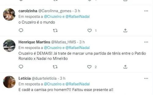 O tenista foi abordado sobre sua relação com Ronaldo Fenômeno, já que Nadal o considera seu maior ídolo no futebol: “Não falou muito do Cruzeiro, porque falei do Valladolid que é outra equipe espanhola que adquiriu faz tempo. Cruzeiro é um clube histórico dentro do mundo do futebol, especialmente aqui no Brasil, mas todos na Europa conhecem o Cruzeiro, e o Cruzeiro tem o Ronaldo como referência. Creio que é algo muito bonito que uma grande lenda como Ronaldo siga envolvida e interessada por seguir no futebol. Isso faz dele (futebol) melhor e maior, é uma notícia muito, muito boa”, detalhou o número 2 do Tenis mundial.