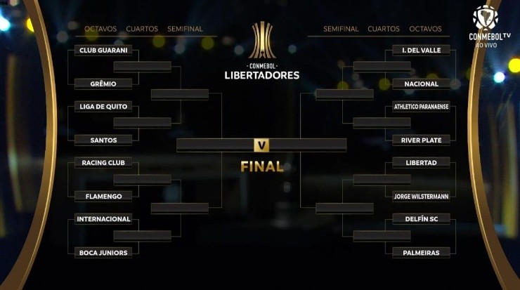 Campeão em 2017, o Grêmio pegará o Guarani do Paraguai, que foi o segundo colocado do grupo B. O Palmeiras, melhor time da fase anterior, irá duelar com o Delfín, do Equador. OInternacional, que se classificou na segunda posição no grupo E, terá como adversário o Boca Juniors, decidindo na La Bombonera.