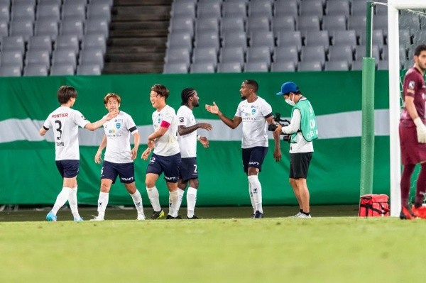 Saulo Mineiro (primeiro da direita para a esquerda) em ação com a camisa do Yokohama FC – Foto: Divulgação