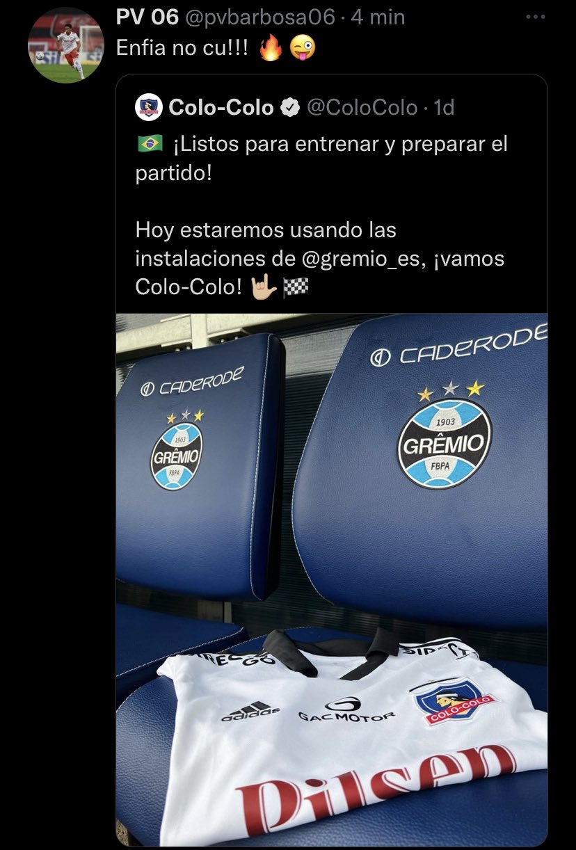 "Enfia no..."; após goleada do Inter, PV perde a linha e zoa postagem do Colo-Colo citando CT do Grêmio