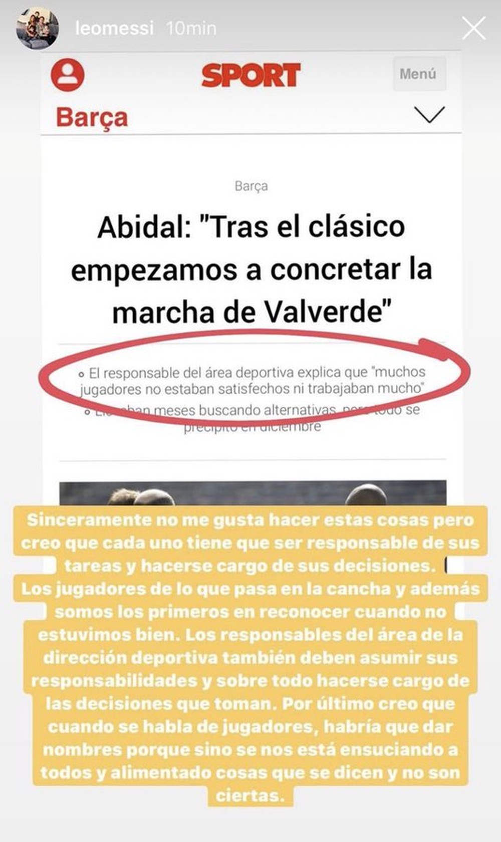 Messi, sendo um dos principais líderes do Camp Nou, não gostou da fala de Abidal. Os dois haviam jogado juntos no início de carreira do meio-campista argentino, entre os anos de 2007 e 2013. Para o camisa 10, Éric deveria revelar os nomes insatisfeitos com o trabalho de Valverde e não aliviou para o francês. O canhoto cobrou responsabilidade das pessoas que tomam as decisões nos bastidores e ainda aproveitou para pedir reforços.