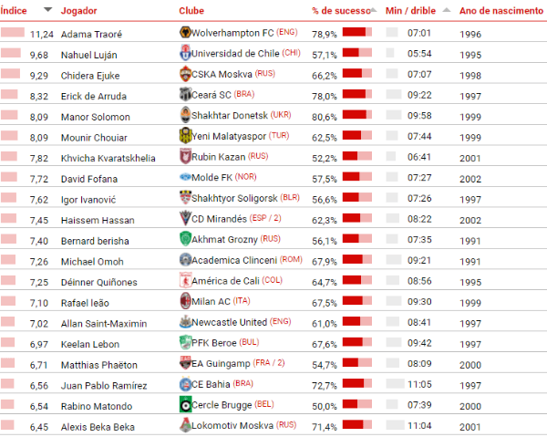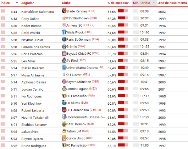 Figurar no ranking não é uma tarefa fácil, já que a escolha segue uma linha criteriosa para eleger os nomes da lista de melhores dribladores. A formatação da lista leva em conta atletas que tentaram pelo menos 40 dribles, em uma segunda etapa de análise, é considerado o número de acertos a cada 100 minutos de jogo. O camisa 27 do Time do Povo tem uma média de respeito, cravando 8.32 dribles, com um aproveitamento de 78%.