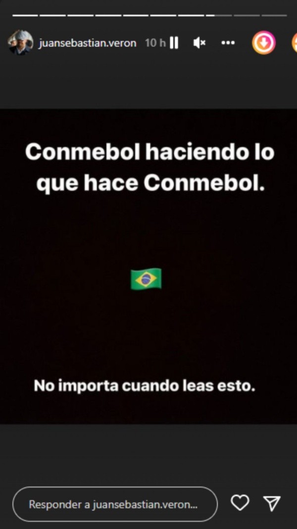 Dois lances polêmicos chamaram a atenção no embate. O presidente da equipe hermana, Juan Sebastián Verón, ficou revoltado. Ídolo dos torcedores, o mandatário cuspiu fogo nas redes sociais e deixou a entidade máxima do futebol sul-americano contra a parede: “Conmebol fazendo o que faz a Conmebol. Não importa quando leia isto”, disparou o executivo, com uma bandeira do Brasil junto.