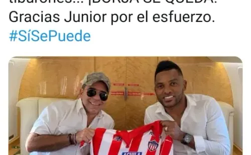 Há pouco, o ex-prefeito de Barranquilla, Alejandro Char – irmão do presidente do Junior, Fuad Char – fez uma postagem bombástica em sua conta no Instagram. Foram segundos de alegria para a torcida: “O presidente adiantado aos Tiburones: Borja permanece. Obrigado ao Júnior por todo esforço”, escreveu o empresário, que, segundos depois, apagou a mensagem.