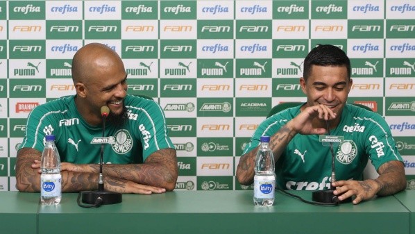 Felipe Melo cutucando e Dudu tentando segurar a risada no meio da coletiva… ������ pic.twitter.com/6g4S9O0ayF