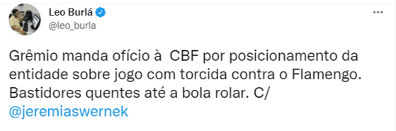 Nesta sexta-feira (10), o Grêmio enviou um ofício à CBF (Confederação Brasileira de Futebol), no qual cobra uma posição da entidade a respeito de o Flamengo estar vendendo ingressos para a partida do próximo dia 15, no Maracanã, pelas quartas de final da Copa do Brasil. A informação é dos repórteres Jeremias Werneck e Léo Burlá, do portal UOL.