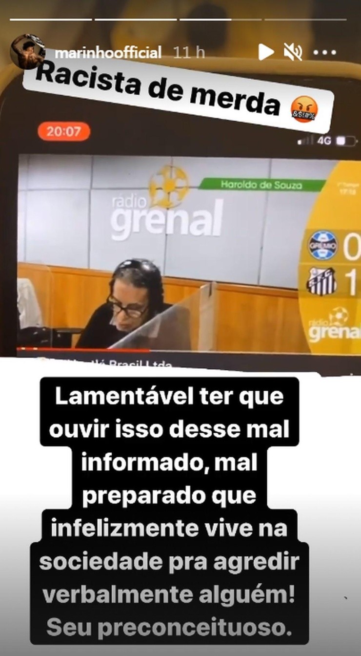 “Lamentável ter que ouvir isso desse mal informado, mal preparado que infelizmente vive na sociedade para agredir verbalmente alguém. Seu preconceituoso”, desabafou Marinho, que utilizou seu Instagram para demonstrar sua insatisfação com o caso. Em seus Stories, o atacante chegou a chamar o narrador de “racista de merd*”.