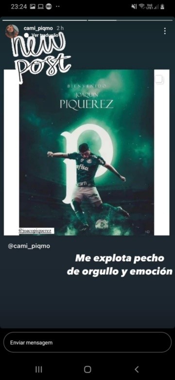 A irmã do jogador, Cami Piquerez, postou em sua conta no instagram, uma espécie de anúncio do acerto do jogador com o Palmeiras, inclusive, com uma montagem em que Piquerez aparece com a camisa do Verdão e os dizeres “Bem-vindo”, em espanhol.