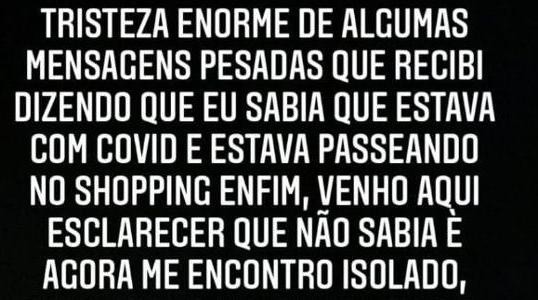 Jobson utilizou os Stories do Instagram para negar que fez o passeio após o diagnóstico. “Como todos já devem saber, fui informado entre 21h30 e 22h que fui diagnosticado com covid-19. Mesmo sem nenhum sintoma, fui pego de surpresa, pois, algumas horas antes, fui até o shopping comprar um presente para a minha esposa. Inclusive, hoje é aniversário dela”, escreveu em sua rede social.