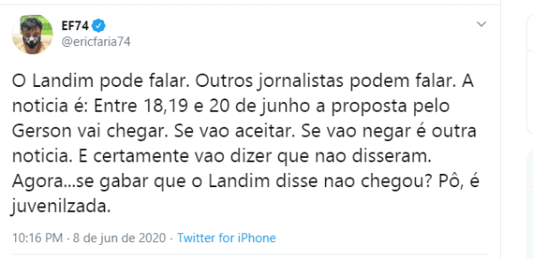 Do estúdio, Cleber Machado chegou a brincar com Landim ao mandar o recado de Eric – de que a proposta chegará entre os dias 18 e 20 de junho. Com bom humor, mas confiando na credibilidade do jornalista da Globo, o mandatário rubro-negro finalizou: “O Gérson é um jogador que a gente adora. É um grande rubro-negro, inclusive. A gente sabe que o Eric Faria sabe tudo do Flamengo, mas espero que ele esteja enganado.”