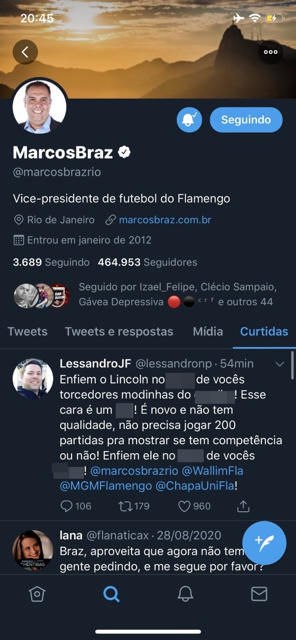 Se não bastasse o tropeço, o vice-presidente de futebol, Marcos Braz, também se envolveu em uma polêmica nas redes sociais. O dirigente curtiu uma publicação de um torcedor xingando o Lincoln e fazendo referência que o centroavante não tem qualidade para vestir a camisa flamenguista. A “curtida” do cartola causou um alvoroço nas redes sociais e o homem forte do futebol tratou logo dedescurtiro conteúdo do seu Twitter oficial.