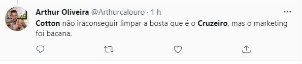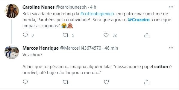 O Cruzeiro deve anunciar em breve, o patrocínio da marca de papel higiênico Cotton. Logo que o provável acerto foi anunciado, a torcida do Atlético foi ao delírio nas redes sociais, aproveitando o gancho para disparar inúmeras piadas relacionadas ao produto que vai ser propagandeado, com a situação que o rival vivência.