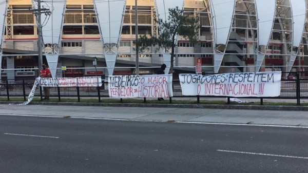 Diversas faixas pedindo a saída do diretor de futebol do clube,Rodrigo Caetano, e do presidenteMarcelo Medeiros, foram estendidas em frente ao centro de treinamento e também aos arredores doBeira-Rio, além de pichaçõesem muitospontos de Porto Alegre. O mandatário, inclusive, se posicionou publicamente pela primeira vez sobre o caso.