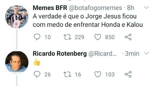 Em um desses comentários, via Twitter, Rotenberg entrou na brincadeira e enviou um sinal de positivo, após um dos torcedores ter informadoum possível medo do português em enfrentar as novas contratações feitas pelo Botafogo. A participação do dirigente viralizou e ascendeu ainda mais os ânimosdos botafoguenses.
