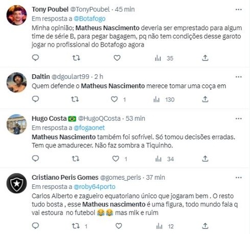 Um dos atletas mais criticados pela torcida do Bota foi a cria, Matheus Nascimento, alvo central de comentários negativos na web. Inclusive, diversas postagens pediam que o jogador deixasse General Severiano, porém, Castro detalhou a situação do jovem: