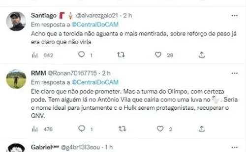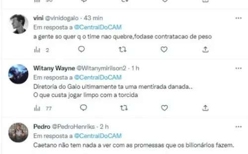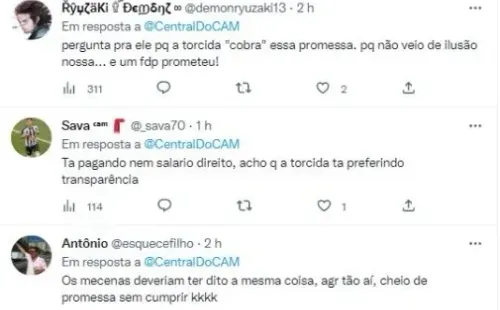 Porém, outros escancararam a insatisfação, classificando o comportamento da direção, como mentiroso: “Acho que a torcida não aguenta e mais mentirada, sobre reforço de peso já era claro que não viria”. O Galo até que se movimentou por reforços e conseguiu anunciar nomes interessantes, até o momento, foram contratados: de Bruno Fuchs, Paulinho, Edenílson, Paulo Henrique. Igor Gomes tem conversas avançadas e Patrick segue no interesse do Galo.