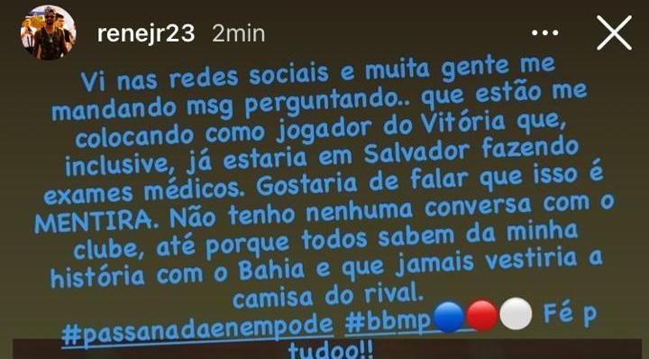 Renê precisou ir a público se explicar pelo ocorrido. Em tom de desabafo, o volante enfatizou que nunca vestiria a camisa do Vitória por amor e respeito ao Esquadrão.