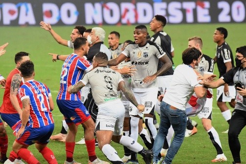A briga generalizada na final da Copa do Nordeste 2021 entre jogadores do Bahia e Ceará ainda reverbera e nesta quinta-feira (15), apresentou desdobramentos quanto às punições. Os atletas que se envolveram tiveram suas suspensões ampliadas. Os dois clubes também sentirão a confusão no bolso, já que as multas a ambos também tiveram aumentos. O Esquadrão ainda perdeu um mando de campo por conta da ‘trocação’ explícita na Arena Castelão.