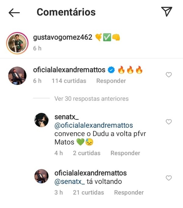 Mas, se para a diretoria palmeirense e para o empresário do jogador, as negociações estão travadas, Alexandre Mattos agitou os torcedores do Maior Campeão do Brasil no final da tarde desta quarta-feira (12). Ao interagir com um torcedor, o ex-diretor do Alviverde afirmou que o Verdão e o atacante voltarão a ser feliz felizes novamente em breve. “Tá voltando”, revelou o dirigente.