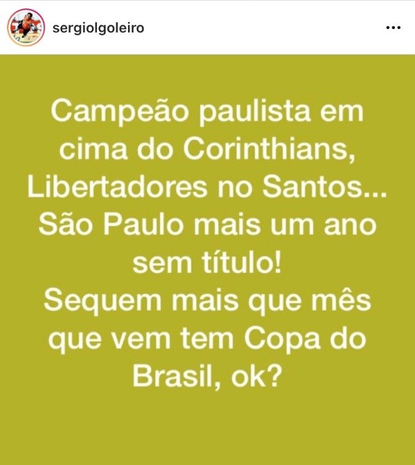 Se nas redes sociais os torcedores rivais do Verdão zoaram muito a derrota ainda na semifinal do Mundial, o ex-goleiro Sérgio fez questão de lembrar que Corinthians, São Paulo e Santos vão terminar 2020 sem títulos e precisam ficar bem quietinhos.