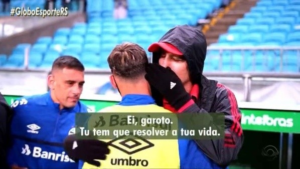 Tudo aconteceu quando os jogadores do Grêmio foram cumprimentar seu ex-treinador. A imagem do conselho foi captada e o Globo Esporte, da RBS TV, levou ao ar nesta quinta-feira (26). O jogador vive um momento de polêmicas no clube gaúcho, com direito a ausência em tratamento de lesão e negociação enrolada com clube Norte-Americano que acabou fadada ao fracasso.