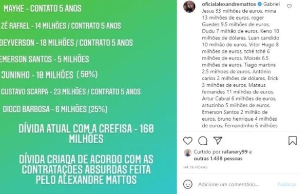 A rebatida virtual aconteceu na última segunda-feira (24). A postagem dos torcedores se referiu a uma série de contratações que apontam como “absurdas”, além de citar que Mattos foi responsável por fazer uma dívida com a Crefisa, patrocinadora do Palmeiras. O ex-dirigente do Palestra não deixou por menos, afirmando que “resgatou” a autoestima do Verdão: