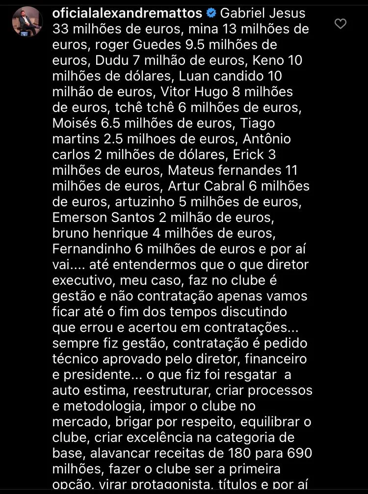 “Até entendermos que o que diretor executivo, meu caso, faz no clube é gestão e não contratação apenas vamos ficar até o fim dos tempos discutindo que errou e acertou em contratações… Sempre fiz gestão, contratação é pedido técnico aprovado pelo diretor, financeiro e presidente… O que fiz foi resgatar a autoestima, reestruturar, criar processos e metodologia, impor o clube no mercado, brigar por respeito, equilibrar o clube, criar excelência na categoria de base, alavancar receitas de 180 para 690 milhões, fazer o clube ser a primeira opção, virar protagonista, títulos e por aí vai… Não fui e não sou perfeito… Sempre à disposição… Saúde a todos”, cravou oex-executivo palmeirense.
