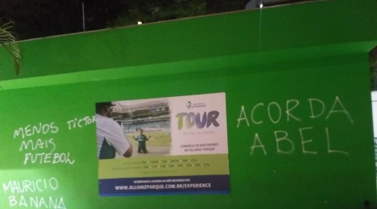 Na madrugada deste sábado (17), após a derrota por 1 a 0 para o São Paulo, os muros do Allianz Parque foram pixados por torcedores do Verdão. Além de pedidos por reforços, saídas de jogadores e críticas à diretoria, houve uma mensagem para Abel Ferreira “acordar”.
