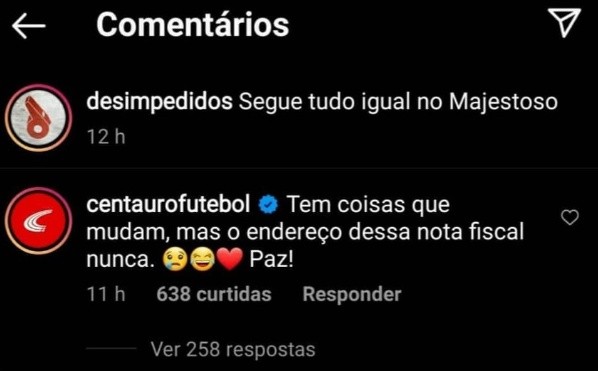Na tarde desta segunda (03), vários perfis ligados à torcida do São Paulo reprovaram comentários do perfil da Centauro após o empate em Itaquera, que manteve a sina do São Paulo de nunca ter vencido o Corinthians na casa do rival. “Tem coisas que mudam, mas o endereço dessa nota fiscal (NF) nunca. Paz”, respondeu o perfil das lojas ao post do Desimpedidos que dizia “Segue tudo igual no Majestoso”.