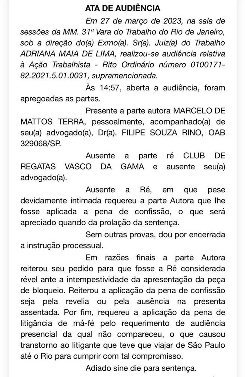 “Hoje ocorreu a audiência de instrução, na qual as partes e testemunhas seriam ouvidas. Essa audiência seria realizada por videoconferência, porém, a pedido do próprio Vasco, foi convertida para presencial. Nós (Marcelo e seu advogado) comparecemos, mas o Vasco não. Foi então aplicada pena de confissão ao Vasco, que é a presunção de veracidade de tudo aquilo que narramos no processo. Ainda pedimos aplicação da pena de litigância de má-fé, pois tivemos que nos deslocar ao Rio de Janeiro e o Vasco, que pediu que a audiência fosse presencial, não apareceu. Agora o processo segue para sentença. E, por tudo aquilo que há de provas no processo, estamos extremamente confiantes”, declarou o advogado de Marcelo Mattos, Filipe Rino.