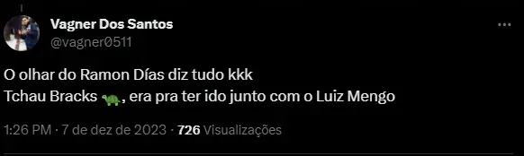 “O olhar do Ramon Días diz tudo kkk Tchau Bracks era pra ter ido junto com o Luiz Mengo”, “FORA BRACKS! Vai tarde” e “Devem ter pedido a saida dele para o presidente, por isso acharam estranho a declaração”, foram algumas reações.