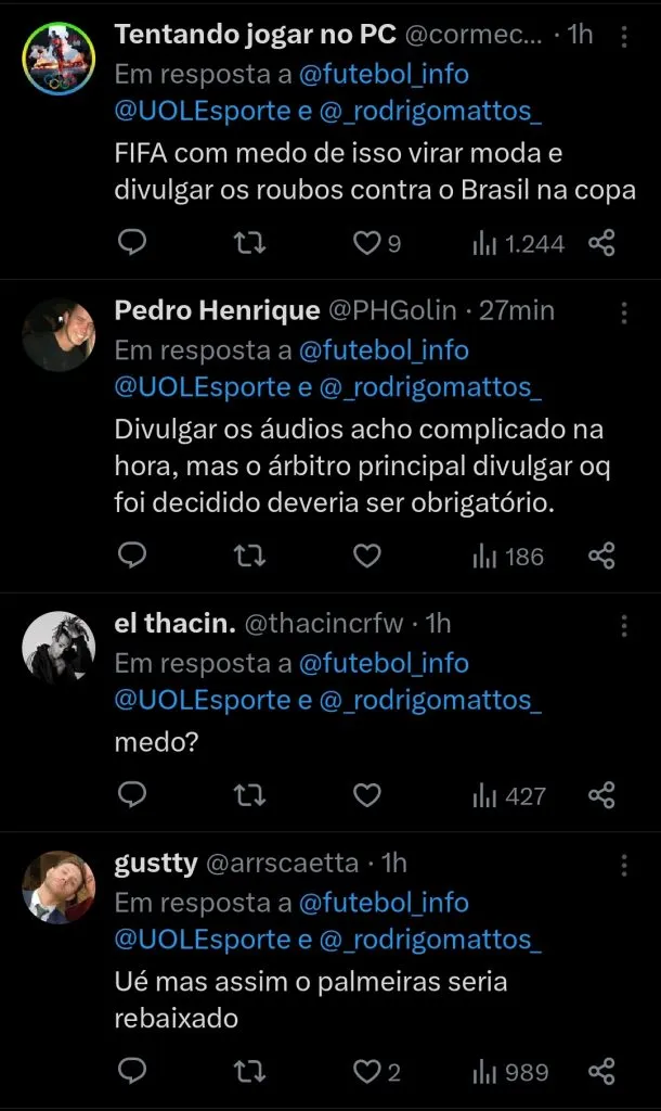 Entretanto, Gianni e companhia negaram o pedido da Confederação, gerando polêmica com internautas: “A CBF buscava mais transparência ao pedir permissão para divulgar áudios do VAR nos estádios, mas a FIFA recusou a solicitação. O debate entre tecnologia e acesso à informação continua no futebol”, comentou um torcedor.