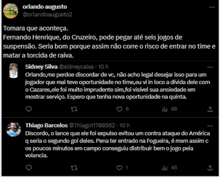 O volante Fernando Henrique, do Cruzeiro, está marcado para ser julgado pelo STJD (Superior Tribunal de Justiça Desportiva) na próxima quinta-feira (19) devido a sua expulsão na partida contra o América-MG, durante a 25ª rodada do Campeonato Brasileiro. A expulsão ocorreu nos minutos finais do clássico no Mineirão, onde Fernando aplicou uma entrada considerada “força incompatível” em Cazares.