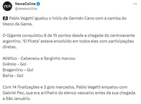 O jogador participou de apenas 5 partidas pelo Vasco, mas já conseguiu marcar três gols. Além do mais, o jogador participou de todos os gols que o Clube fez desde que ele está no time. A sua marca no time, até o momento se assemelha a de Germán Cano, que fez o mesmo número de gols no mesmo número de partidas.