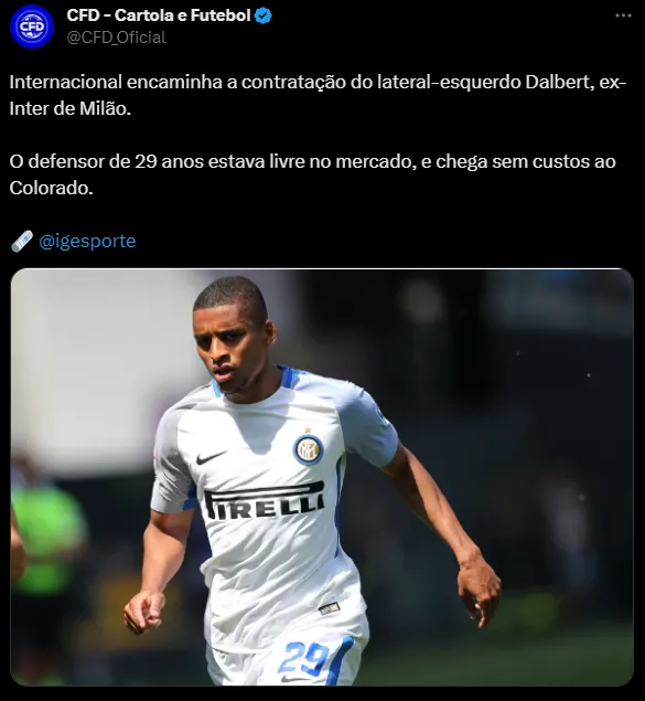 O Internacional está perto de concretizar a contratação do lateral-esquerdo Dalbert, que ficou livre no mercado desde sua saída da Inter de Milão em julho. As negociações entre o jogador e o clube gaúcho avançaram nos últimos dias, com o empresário de Dalbert, Emerson Figueiredo, planejando chegar ao Brasil na quarta-feira para finalizar o acordo.