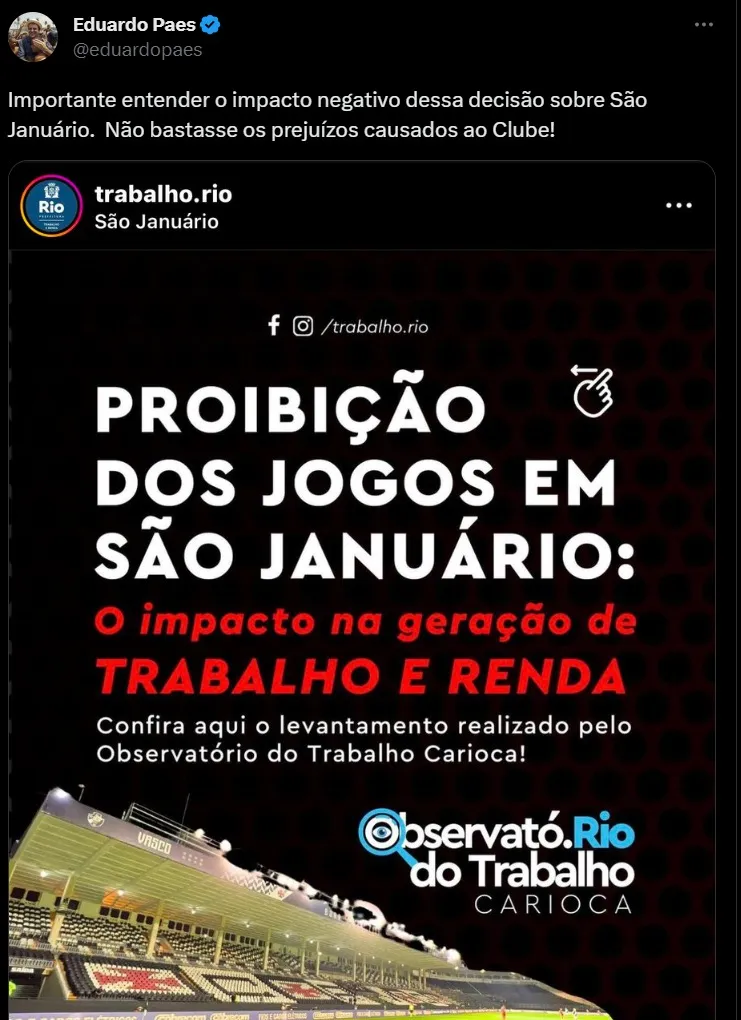 O Gigante da Colina ganhou apoio do governador do Rio de Janeiro, Cláudio Castro, e do prefeito do Rio, Eduardo Paes, que utilizaram as redes sociais para destacar sobre decisão da Justiça em manter a proibição de público em São Januário. Paes ressaltou como isso impacta a população do entorno do estádio. “Importante entender o impacto negativo dessa decisão sobre São Januário. Não bastasse os prejuízos causados ao Clube!”, escreveu o prefeito.