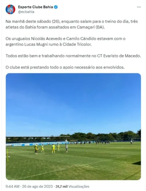 Três jogadores do Bahia foram assaltados quando seguiam para a Cidade Tricolor, o centro de treinamento do clube. Os atletas Lucas Mugni, Nicolás Acevedo e Camilo Candido foram as vítimas da ação dos bandidos, que ocorreu em Camaçari, região metropolitana de Salvador.
