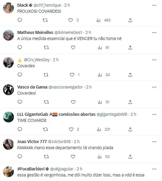 O retorno ao Rio de Janeiro também terá a mesma medida. A torcida se manifestou após a decisão e criticou a postura do clube: “Um time com medo da sua própria torcida .. A que ponto chegamos”, comentou um vascaíno. Outro foi direto ao ponto e ironizou: “A única medida essencial que é VENCER tu não toma né”.