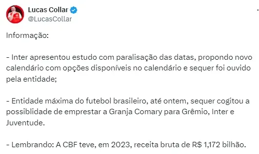 Diante desse cenário, os três clubes do RS pediram a paralisação do Brasileirão. De início, a Confederação Brasileira de Futebol optou por adiar apenas os jogos de Inter, Grêmio e Juventude.