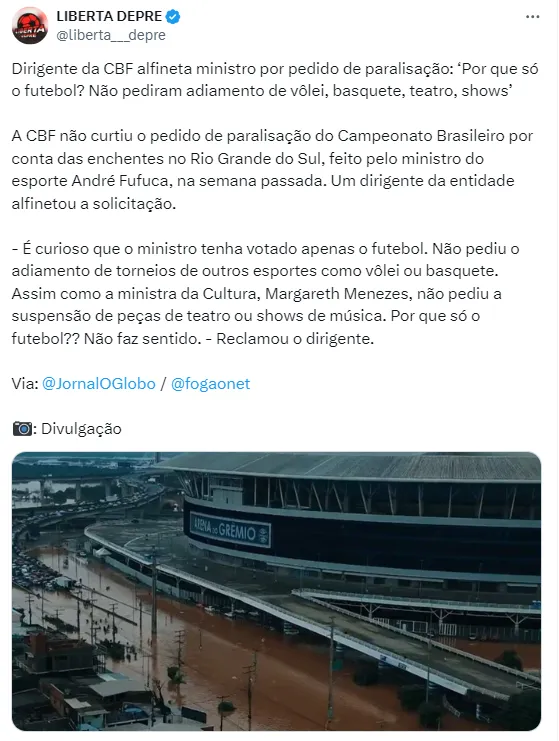 A situação de Grêmio, Internacional e Juventude segue indefinida. Os três times gaúchos querem a paralisação do Campeonato Brasileiro por conta das enchentes que aconteceram no Rio Grande do Sul.