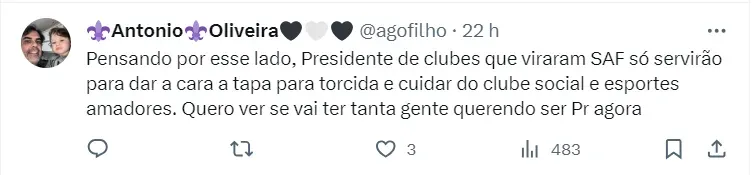 “Pedrinho foi eleito presidente do Vasco. Mas o Vasco é uma SAF. Ele não terá voz ativa na escolha de treinador e jogadores. Ou seja: não vai montar o time. Então, eu me pergunto: porque tanta emoção e barulho na eleição dele? Pedrinho será uma espécie de ‘rainha da Inglaterra’, imagino”, explicou.