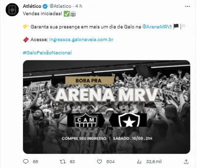 A equipe do Galo vem de um empate em 1 a 1 diante do Athletico, na Ligga Arena, no último dia 2, e quer conseguir chegar a esta marca que será importante ao elenco na competição. O time está na nona colocação com 31 pontos em 22 jogos até aqui.