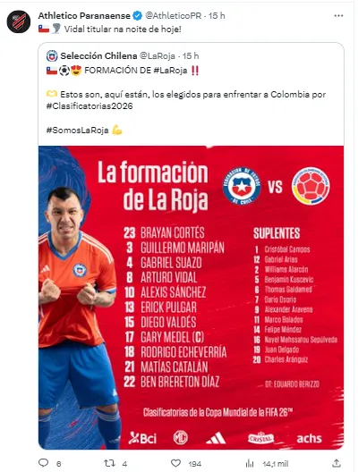 Como a lesão de Vidal precisará de procedimento cirúrgico, o corpo médico da Seleção do Chile e o departamento do Athletico vão analisar a situação após a cirurgia, que será realizada nesta quinta-feira (14), ainda de acordo com informações da jornalista Monique Vilela.