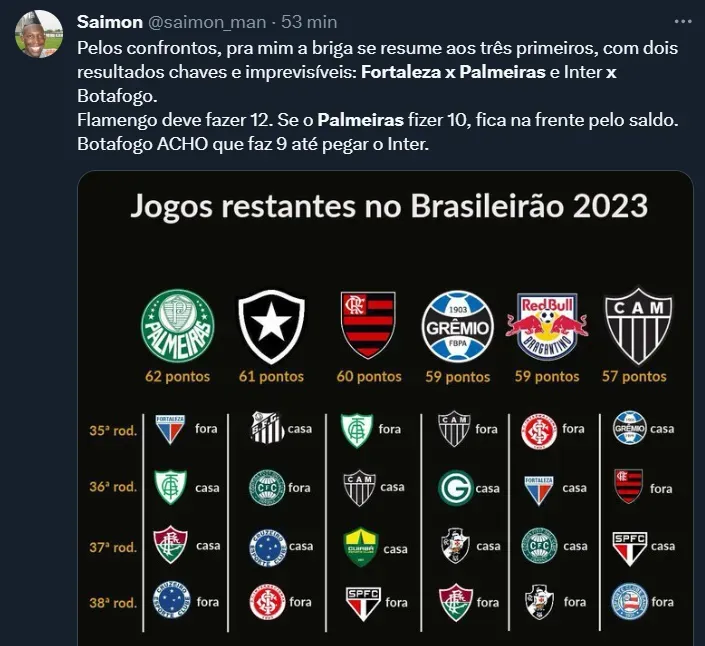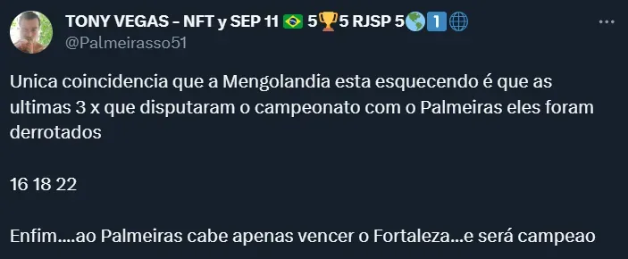 O Palmeiras, que agora depende só de si para o título, precisa somar três pontos para não ser incomodado por Botafogo, Flamengo, Grêmio ou Bragantino em busca de mais uma conquista.