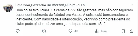 De acordo com o post do setorista que cobre o Vasco, Pedrinho terá participação em 30% da SAF do Vasco. Além dessa porcentagem, o presidente seguirá cuidando de São Januário e dos Esportes Olímpicos do CRVG. E mais, a 777 deve ser cobrada.