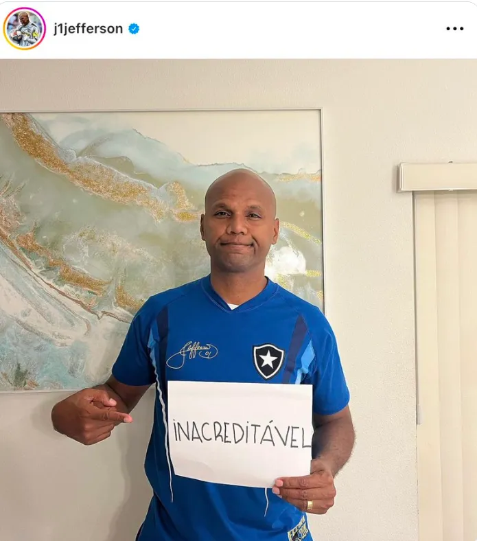 Após o apito final, onde o Botafogo empatou em 1 a 1 com o já rebaixado Coritiba, o ídolo Alvinegro realizou uma publicação nas redes sociais. Uniformizado e com cara de poucos amigos, Jefferson segura uma placa com a palavra ‘inacreditável’ escrita.