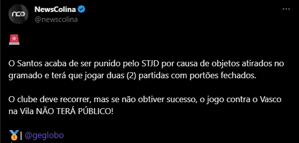 Apesar do jogo ser na Vila Belmiro, o Vasco da Gama recebeu a notícia que o Santos terá que jogar com portões fechados. Por conta de objetos atirados no gramado na partida contra o Grêmio, o STJD puniu o Santos com dois jogos sem torcida. Vale frisar que o Peixão ainda pode recorrer e mudar o cenário, mas a situação atual é essa.