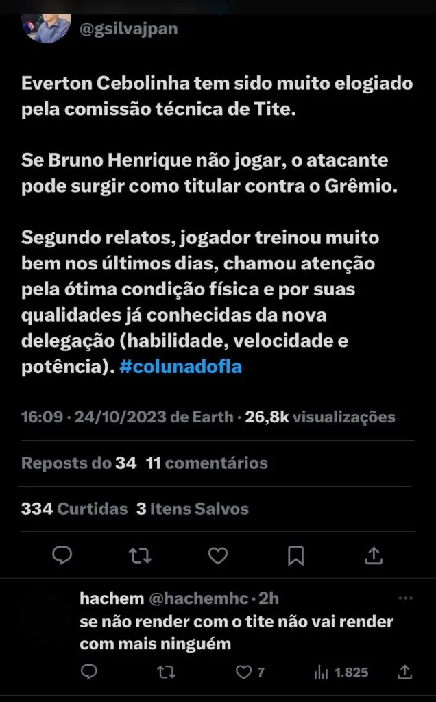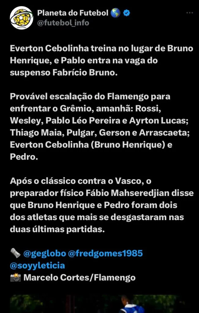 De acordo com o jornalista Guilherme Silva do mesmo portal, caso Bruno Henrique não jogue, é provável que Cebolinha seja o titular na partida. O jogador vem treinando bem nos últimos dias, a sua ótima condição física e qualidades como habilidade, velocidade e potência estão agradando ao treinador do Flamengo.