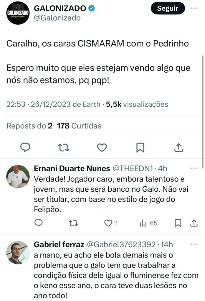 Empresário do meia Pedrinho, Will Dantas já deixou claro a pessoas mais próximas e também ao Shakhtar Donetsk que o Galo em breve formalizará uma proposta para comprar o jogador ao fim do período de empréstimo, que encerra em junho de 2024.