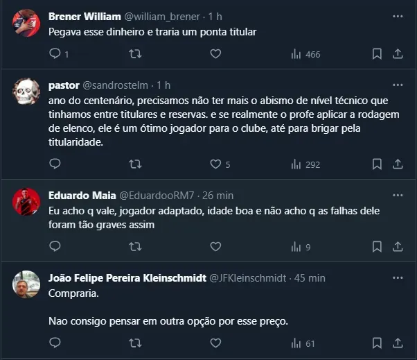 Dessa forma, como o assunto vazou na web, alguns torcedores do Furacão debateram sobre o assunto e a maioria aprova a compra. Vale frisar que o Athletico estreia na temporada no próximo dia 17 de janeiro.